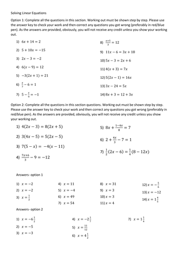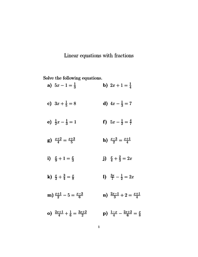 Linear Equations With Fractions Worksheet With Solutions Teaching Resources